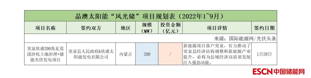 截至2022年9月30日,晶澳太陽(yáng)能共簽約(規(guī)劃)1個(gè)風(fēng)光儲(chǔ)項(xiàng)目,項(xiàng)目規(guī)模為200MW。