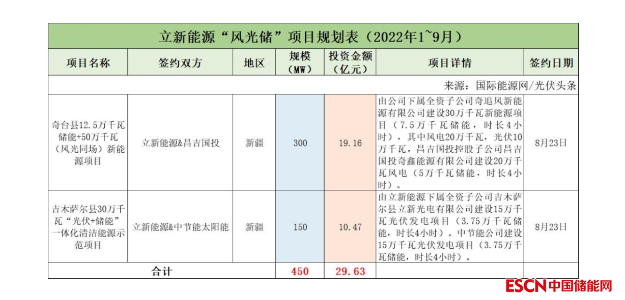 截至2022年9月30日,立新能源共簽約(規(guī)劃)2個(gè)風(fēng)光儲(chǔ)項(xiàng)目,項(xiàng)目規(guī)模為450MW,投資金額為29.63億元。
