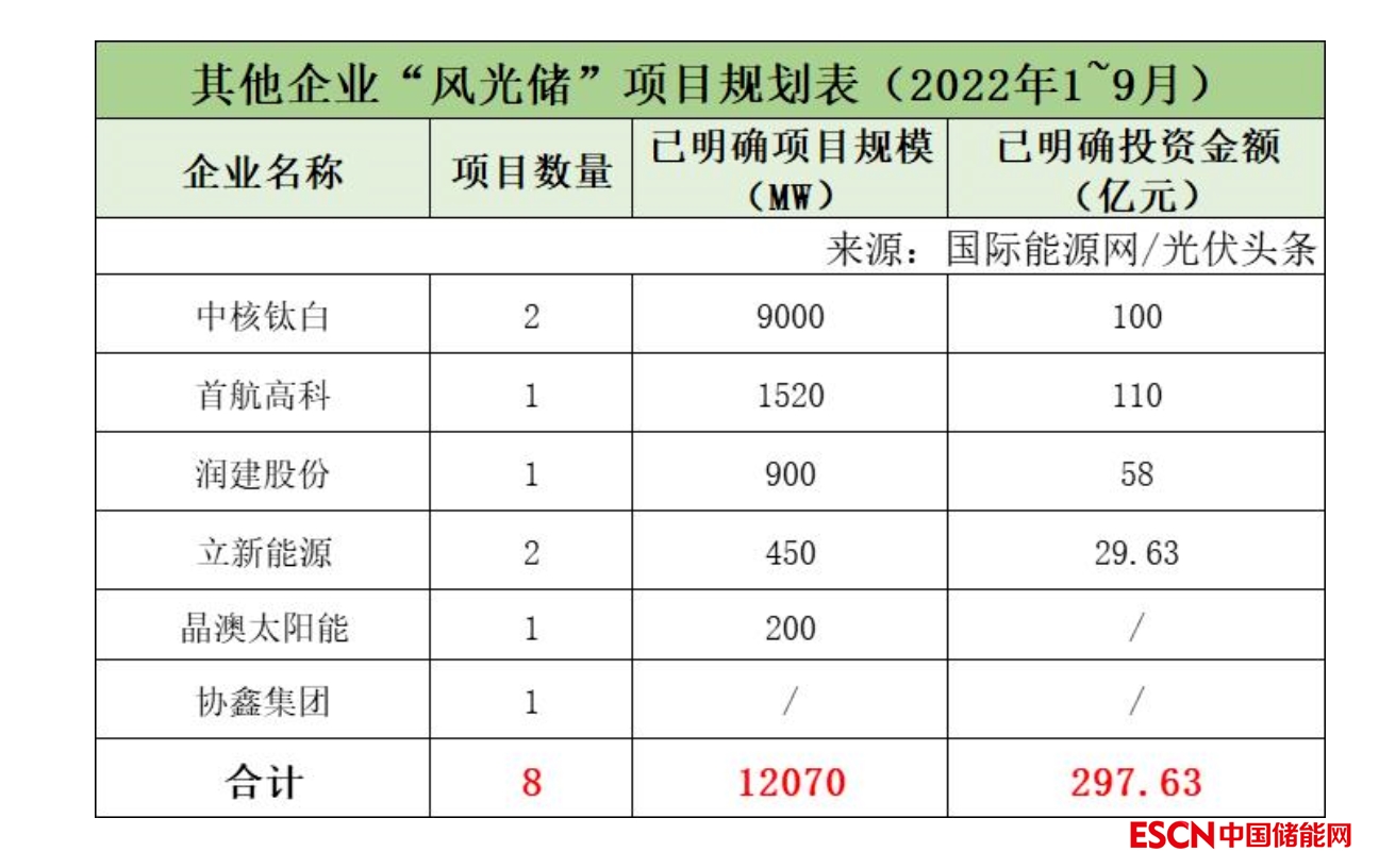 截至2022年9月30日,國(guó)家能源集團(tuán)共簽約(規(guī)劃)7個(gè)風(fēng)光儲(chǔ)項(xiàng)目,明確項(xiàng)目規(guī)模共計(jì)10.11GW,有1個(gè)項(xiàng)目明確投資金額160億元。