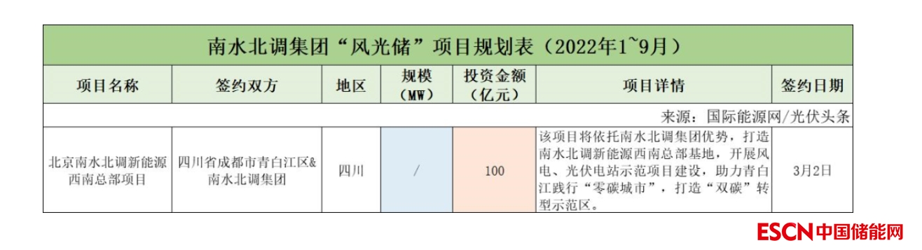 截至2022年9月30日,南水北調(diào)集團(tuán)共簽約(規(guī)劃)1個(gè)風(fēng)光儲(chǔ)項(xiàng)目,投資金額為100億元。