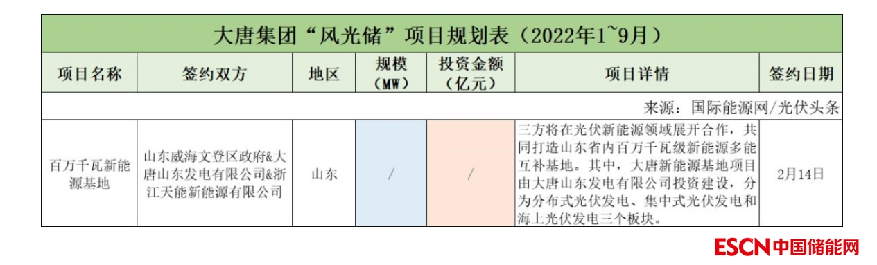 截至2022年9月30日,大唐集團(tuán)共簽約(規(guī)劃)1個(gè)風(fēng)光儲(chǔ)項(xiàng)目,該項(xiàng)目只簽署了合作協(xié)議。