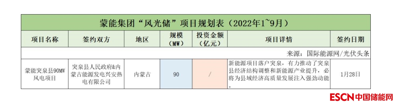 截至2022年9月30日,蒙能集團(tuán)共簽約(規(guī)劃)1個(gè)風(fēng)光儲(chǔ)項(xiàng)目,項(xiàng)目規(guī)模為90MW。