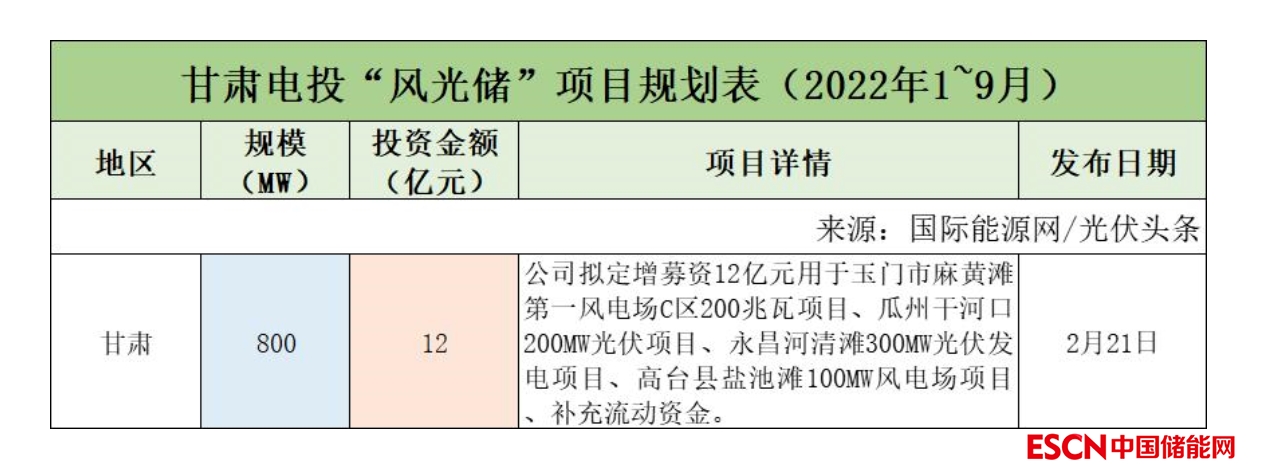 截至2022年9月30日,甘肅電投共規(guī)劃1個(gè)風(fēng)光儲(chǔ)項(xiàng)目,項(xiàng)目規(guī)模為800MW,投資金額12億元。