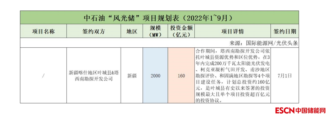 截至2022年9月30日,中石油共簽約(規(guī)劃)1個(gè)風(fēng)光儲(chǔ)項(xiàng)目,明確規(guī)模共計(jì)2GW,明確投資金額160億元。