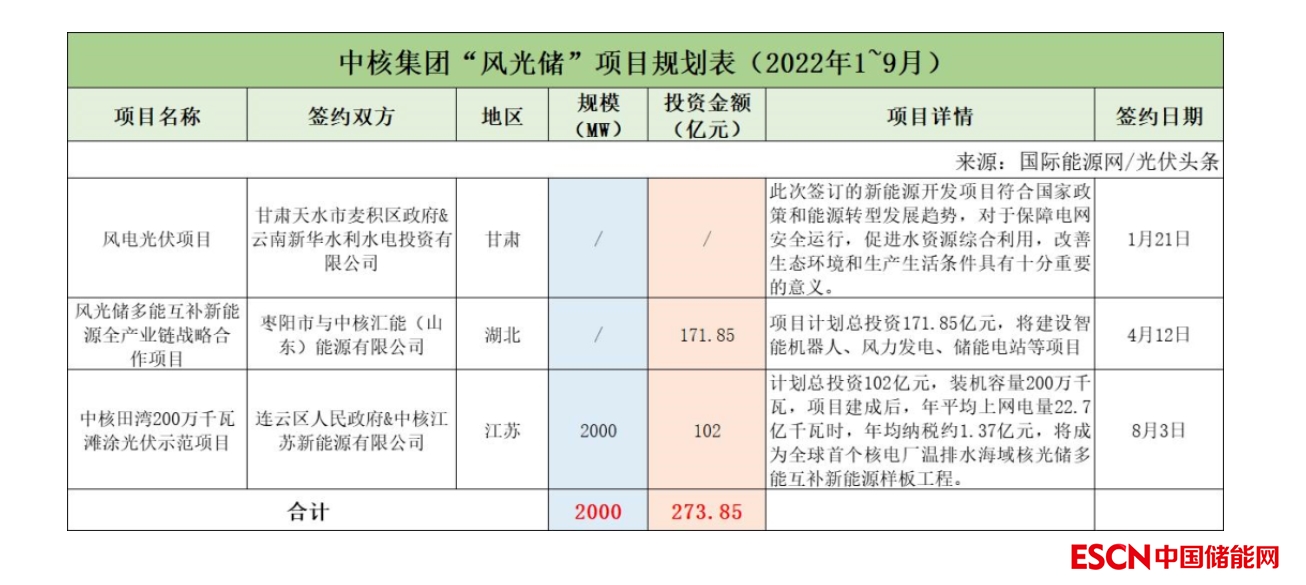 截至2022年9月30日,中核集團(tuán)共簽約(規(guī)劃)3個(gè)風(fēng)光儲(chǔ)項(xiàng)目,明確規(guī)模共計(jì)2GW。其中有2個(gè)項(xiàng)目明確投資金額273.85億元。