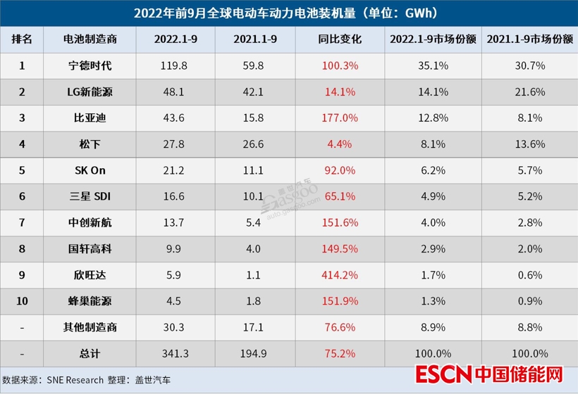 2022年1月至9月,全球電動(dòng)汽車電池裝機(jī)量達(dá)到341.3 GWh,同比增長(zhǎng)75.2%,繼續(xù)維持了自2020年第三季度以來(lái)的增長(zhǎng)趨勢(shì)。