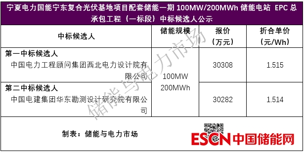中國(guó)儲(chǔ)能網(wǎng)訊:近日,寧夏電力國(guó)能寧東復(fù)合光伏基地項(xiàng)目配套儲(chǔ)能一期100MW/200MWh儲(chǔ)能電站 EPC總承包工程(一標(biāo)段)中標(biāo)候選人公示對(duì)外發(fā)布。中國(guó)電力工程顧問集團(tuán)西北電力設(shè)計(jì)院有限公司總報(bào)價(jià)30308萬元,折合單價(jià)1.515元/Wh,成為第一中標(biāo)候選人。