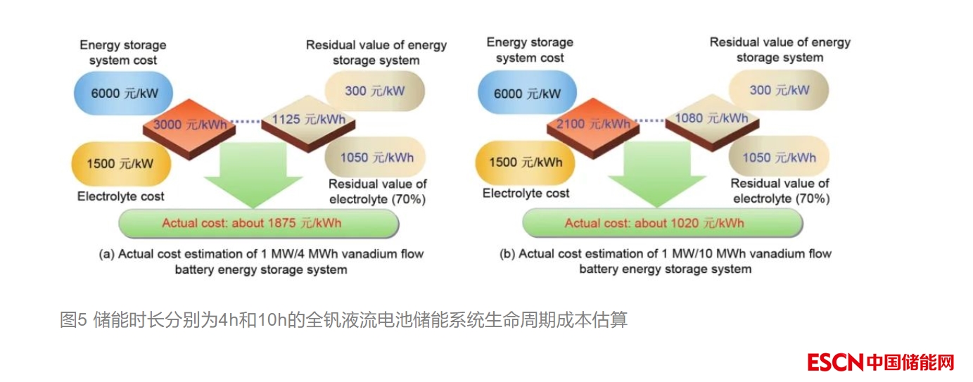 綜上所述,對(duì)于儲(chǔ)能時(shí)長(zhǎng)為4h的全釩液流電池儲(chǔ)能系統(tǒng),初次投資成本約為3000元/kWh,電解液的成本(價(jià)格)約占系統(tǒng)總成本的50%;而對(duì)于儲(chǔ)能時(shí)長(zhǎng)為10h的儲(chǔ)能系統(tǒng),初次投資成本約為2100元/kWh,電解液的成本占系統(tǒng)總成本的70%。由于全釩液流電池的電解液可在線或離線再生循環(huán)使用,1kWh電解液約需要8kg高純度的V2O5,所以,釩電解液的殘值很高。電池系統(tǒng)運(yùn)行15—20年報(bào)廢后,除電解液可循環(huán)利用外,電堆的電極和雙極板(碳材料)及電極框(塑料)可作為燃料使用,燃燒后只產(chǎn)生CO2和H2O,集流板為銅板,端板為鋁合金板或鑄鐵板,緊固螺桿為鋼材料,電池系統(tǒng)報(bào)廢后,很容易回收循環(huán)利用。全釩液流電池儲(chǔ)能系統(tǒng)報(bào)廢后,具有很高的殘值,而且回收利用簡(jiǎn)單。圖5為儲(chǔ)能時(shí)長(zhǎng)分別為4h(如1MW/4MWh)和儲(chǔ)能時(shí)長(zhǎng)為10h(如1MW/10MWh)全釩液流電池儲(chǔ)能系統(tǒng)生命周期的成本估算。對(duì)于儲(chǔ)能時(shí)長(zhǎng)為4h的系統(tǒng),初次投資成本為3000元/kWh,使用15年以上電池系統(tǒng)報(bào)廢后,如果電池系統(tǒng)廢金屬的殘值估值為300元/kW,電解液的殘值按70%估算為1050元/kWh,這樣電池系統(tǒng)的殘值為1125元/kWh,實(shí)際成本約為1875元/kWh。而對(duì)于儲(chǔ)能時(shí)長(zhǎng)為10h的儲(chǔ)能系統(tǒng),初始投資成本為2100元/kWh,使用15年以上電池系統(tǒng)報(bào)廢后,電池系統(tǒng)廢金屬等的殘值估值為300元/kW,電解液的殘值按70%估算為1050元/kWh,這樣電池系統(tǒng)的殘值為1080元/kWh,實(shí)際成本僅為1020元/kWh。所以,上述分析說明從生命周期角度來講,全釩液流電池除了安全性好、使用壽命長(zhǎng)外,還具有性價(jià)比高、經(jīng)濟(jì)性好、環(huán)境負(fù)荷低的優(yōu)勢(shì)。因此,全釩液流電池是高功率、大容量、長(zhǎng)時(shí)儲(chǔ)能技術(shù)的最佳選擇。