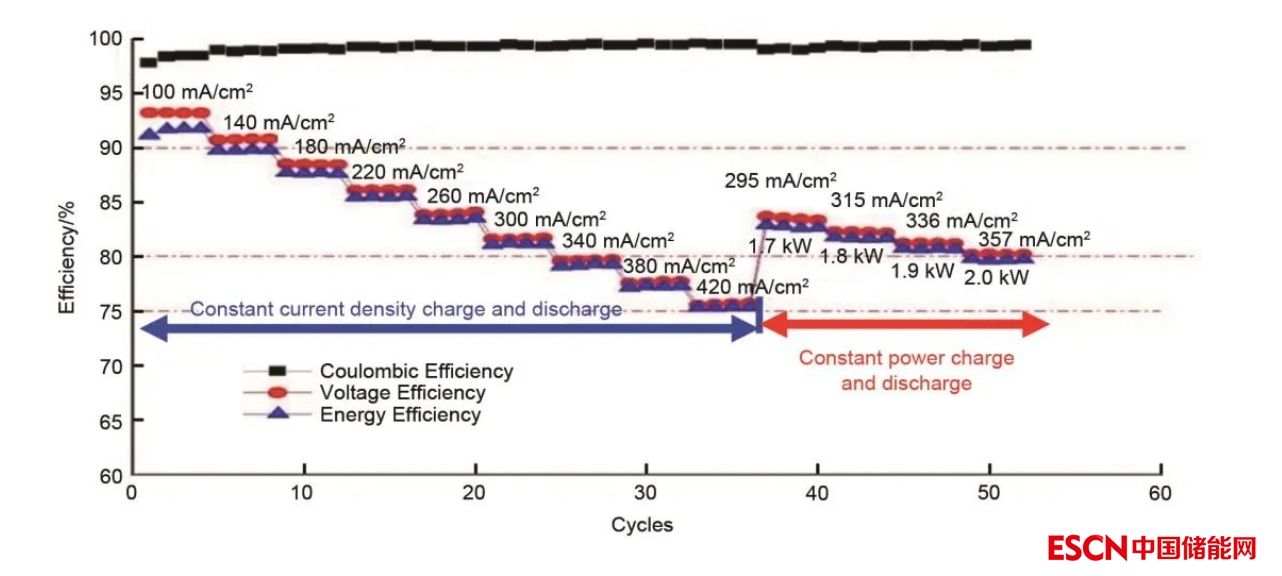 多年來,大連化學(xué)物理研究所—融科儲(chǔ)能合作團(tuán)隊(duì),在電池材料,包括電解質(zhì)溶液、非氟離子傳導(dǎo)膜、碳塑復(fù)合雙極板和電堆結(jié)構(gòu)設(shè)計(jì)技術(shù)方面都取得了創(chuàng)新性的技術(shù)突破,開發(fā)出高導(dǎo)電性、高韌性碳塑復(fù)合雙極板,高導(dǎo)電性、高離子選擇性離子傳導(dǎo)膜,同時(shí),通過數(shù)值模擬和實(shí)驗(yàn)驗(yàn)證,掌握了高功率密度電堆的設(shè)計(jì)方法,大幅度降低了電堆的歐姆極化,從而在保持電堆的充放電能量效率大于80%的前提條件下,電堆的額定工作電流密度大幅度提高。圖3為2kW電堆在恒電流密度和恒功率密度充放電時(shí)電堆的庫(kù)侖效率、電壓效率和能量效率。在2kW恒功率充放電時(shí),在保持電堆的能量效率大于80%時(shí),工作電流密度345mA/cm2,電堆的功率密度顯著提高,從而大幅度降低了電池的制造成本。
