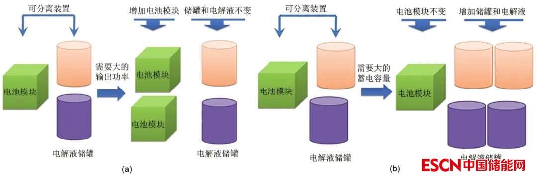 (a)要增加輸出功率,僅需增加電堆的數(shù)量;(b)要增加儲(chǔ)能容量,僅需增加電解液的體積