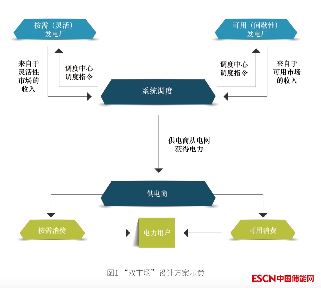 從2017年起,包括英國牛津能源研究所、國際能源署和希臘政府在內(nèi)的組織機(jī)構(gòu)與國家開始討論新能源大規(guī)模接入條件下的“雙市場”設(shè)計(jì)方案,如圖1所示。其出發(fā)點(diǎn)是當(dāng)前的純能量電力市場已經(jīng)難以正常運(yùn)轉(zhuǎn)。