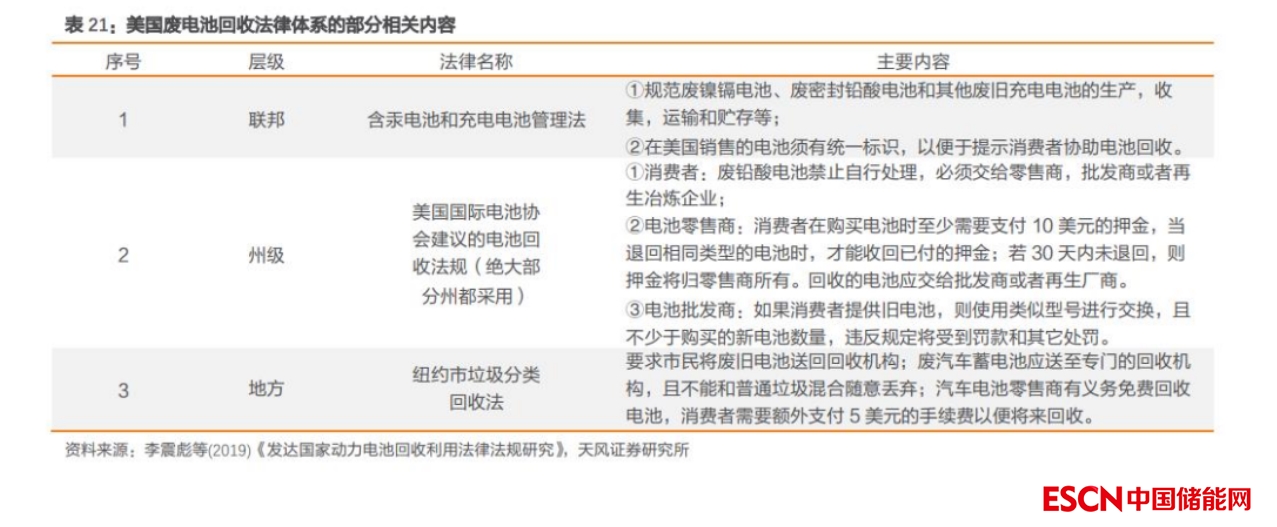 美國:以生產(chǎn)者延伸責(zé)任制為原則,實(shí)施汽車電池押金制度。相較于歐盟對各回收環(huán)節(jié)的責(zé)任進(jìn)行嚴(yán)格立法,美國更傾向于采用市場調(diào)節(jié)的方式進(jìn)行管理約束。首先,美國同樣確立了以生產(chǎn)者責(zé)任延伸為原則的回收體系:1)電池生產(chǎn)者在生產(chǎn)電池的時(shí)候要建立統(tǒng)一標(biāo)識(shí),以便于回收再利用;2)美國電池生產(chǎn)商需負(fù)責(zé)組織回收這些廢舊電池,并對此承擔(dān)相關(guān)責(zé)任。除此之外,美國國際電池協(xié)會(huì)還設(shè)立了押金制度,規(guī)定消費(fèi)者在購買汽車電池時(shí)必須繳納電池押金,以促使消費(fèi)者后續(xù)主動(dòng)上交廢舊電池產(chǎn)品。最后,政府會(huì)在廢舊電池回收企業(yè)和電池制造企業(yè)間構(gòu)建經(jīng)濟(jì)協(xié)作關(guān)系,并過協(xié)議價(jià)格引導(dǎo)電池生產(chǎn)企業(yè)履行生產(chǎn)商的責(zé)任,并確保廢舊電池回收企業(yè)獲得利潤。