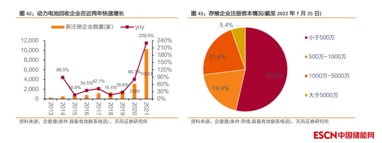 (2) 存續(xù)企業(yè)以“小作坊”為主,行業(yè)無序競爭問題嚴(yán)峻。截至 2022 年 7 月 25 日,我國存續(xù)動(dòng)力電池回收企業(yè)共 14265 家,其中注冊資本小于 500 萬的企業(yè)有 7646 家,占比高達(dá) 53.60%,行業(yè)呈現(xiàn)“小、散、亂”的發(fā)展現(xiàn)狀。另一方面,行業(yè)還面臨著比較嚴(yán)峻的無序競爭問題,當(dāng)前急需進(jìn)一步規(guī)范,許多 “小作坊”企業(yè)以放棄環(huán)保為代價(jià)開展不正當(dāng)競爭,導(dǎo)致大量退役電池流向了非正規(guī)渠道,給環(huán)境造成了較大壓力。