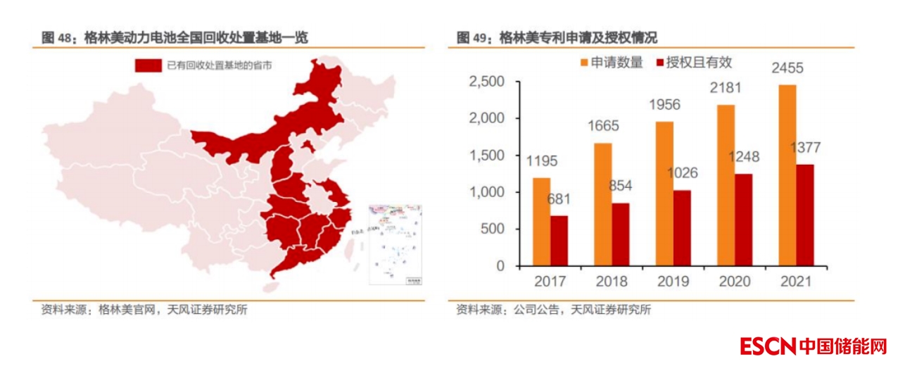 研發(fā)能力卓越,電池回收技術(shù)領(lǐng)先。公司 2021 年在廢物循環(huán)與新能源材料制造領(lǐng)域累計(jì)申請專利 2455項(xiàng),位居“2021 年中國上市公司(滬 A 深 A)專利實(shí)力 500 強(qiáng)”榜單第 206 位。電池回收利用技術(shù)方面,公司鋰回收率超過 90%,鎳、鈷、錳的回收率均超過 99%,處于行業(yè)領(lǐng)先水平。