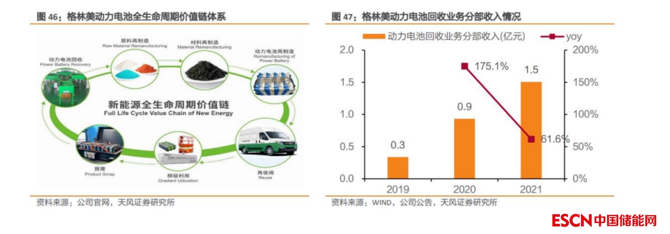 動(dòng)力電池回收業(yè)務(wù)行業(yè)領(lǐng)先,當(dāng)前已進(jìn)入大規(guī)模商用化階段。從市場份額來看,公司動(dòng)力電池回收量全國占比達(dá)到 30%,梯次利用動(dòng)力電池市場份額達(dá)到 20%,循環(huán)再造的新能源鎳鈷電池原料市場份額達(dá)到 30%。從經(jīng)營數(shù)據(jù)看,2021 年公司動(dòng)力電池回收業(yè)務(wù)的分部收入達(dá)到 1.51 億元,同比增長 61.63%;梯級(jí)利用裝機(jī)量達(dá)到 1.06GWh,同比增長 89.29%。公司動(dòng)力電池回收業(yè)務(wù)當(dāng)前已全面進(jìn)入大規(guī)模市場化與商用化階段。
