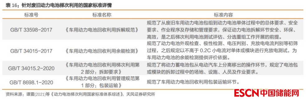 目前針對梯次利用動(dòng)力電池的標(biāo)準(zhǔn)還很少,現(xiàn)行動(dòng)力電池梯次利用的相關(guān)國標(biāo)僅有《車用動(dòng)力電池回收利用拆解規(guī)范》、《車用動(dòng)力電池回收利用余能檢測》、《車用動(dòng)力電池回收利用梯次利用第 2 部分:拆卸要求》和《車用動(dòng)力電池回收利用管理規(guī)范第 1 部分:包裝運(yùn)輸》,分別對應(yīng)梯次利用過程中的拆解、性能檢測、拆卸和包裝運(yùn)輸?shù)惹捌谔幚憝h(huán)節(jié),而對電池電性能、安全性能判別、分選重組及再退役等后續(xù)階段尚未進(jìn)行規(guī)范,梯次利用電池標(biāo)準(zhǔn)體系尚不清晰,規(guī)?;瘧?yīng)用存在難點(diǎn)。