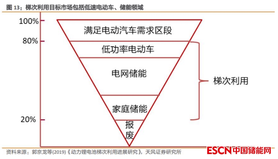 梯次利用目標(biāo)市場包括低速電動(dòng)車、儲(chǔ)能等領(lǐng)域。當(dāng)動(dòng)力電池容量低于 80%時(shí),其性能已經(jīng)不能滿足汽車正常行駛的要求,此時(shí)可以通過將廢舊動(dòng)力電池進(jìn)行改造,應(yīng)用到電池容量要求不高的低速電動(dòng)車、儲(chǔ)能等領(lǐng)域,實(shí)現(xiàn)梯次利用。