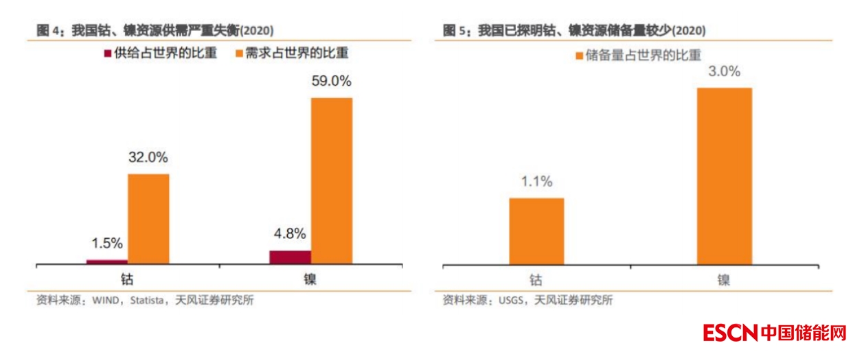 我國鈷、鎳資源供需嚴(yán)重失衡,已探明儲(chǔ)備量極少。從供需角度看,2020 年我國鈷、鎳資源需求分別占據(jù)世界總需求的 32%、59%,而供給量卻僅占世界總額的 1.5%和 4.8%,供需情況嚴(yán)重失衡,對外依存度極高。從資源儲(chǔ)備的角度看,世界已探明鈷資源達(dá) 710 萬噸,集中分布在剛果(50.7%)、澳大利亞(19.7%)等地區(qū);已探明鎳資源達(dá) 9400 萬噸,集中分布在印度尼西亞(22.3%)、澳大利亞(21.3%)、巴西(17.0%)。相較之下,我國已探明鈷、鎳資源儲(chǔ)備量分別僅為 8、280 萬噸,占世界總儲(chǔ)量的比重極低。