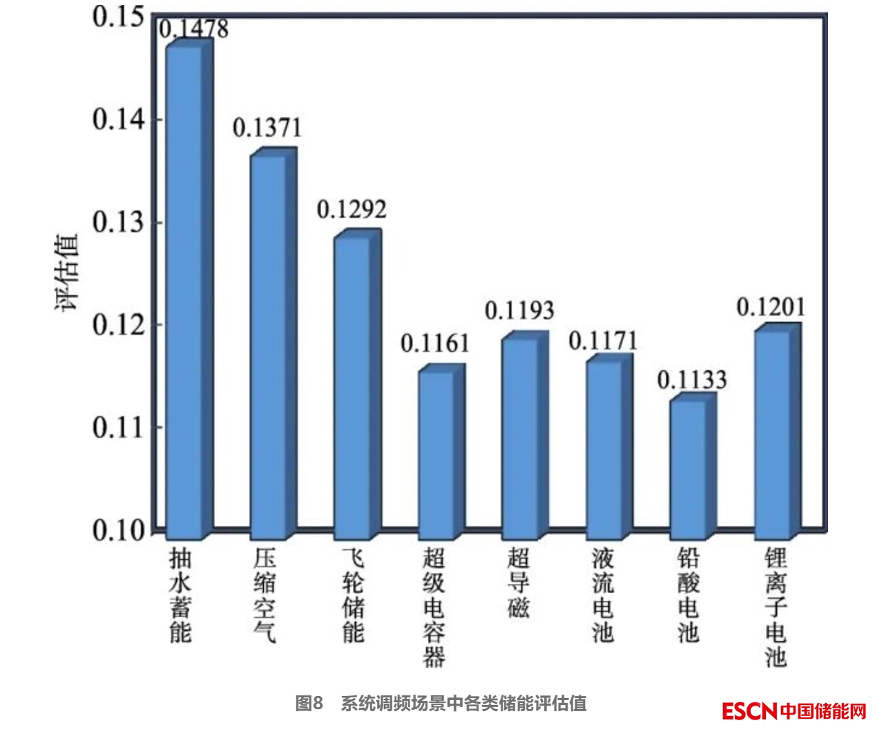 系統(tǒng)調(diào)頻場(chǎng)景下各類(lèi)儲(chǔ)能評(píng)估值如圖8所示。由圖8可知抽水蓄能評(píng)估值最高,為0.147 8,其次壓縮空氣儲(chǔ)能、飛輪儲(chǔ)能、鋰離子電池和超導(dǎo)磁儲(chǔ)能的評(píng)估值分別為0.137 1、0.129 2、0.120 1和0.119 3,權(quán)重占比較低的方案為液流電池和超級(jí)電容器,評(píng)估值分別為0.117 1和0.116 1,鉛酸電池評(píng)估值最低,為0.113 3。