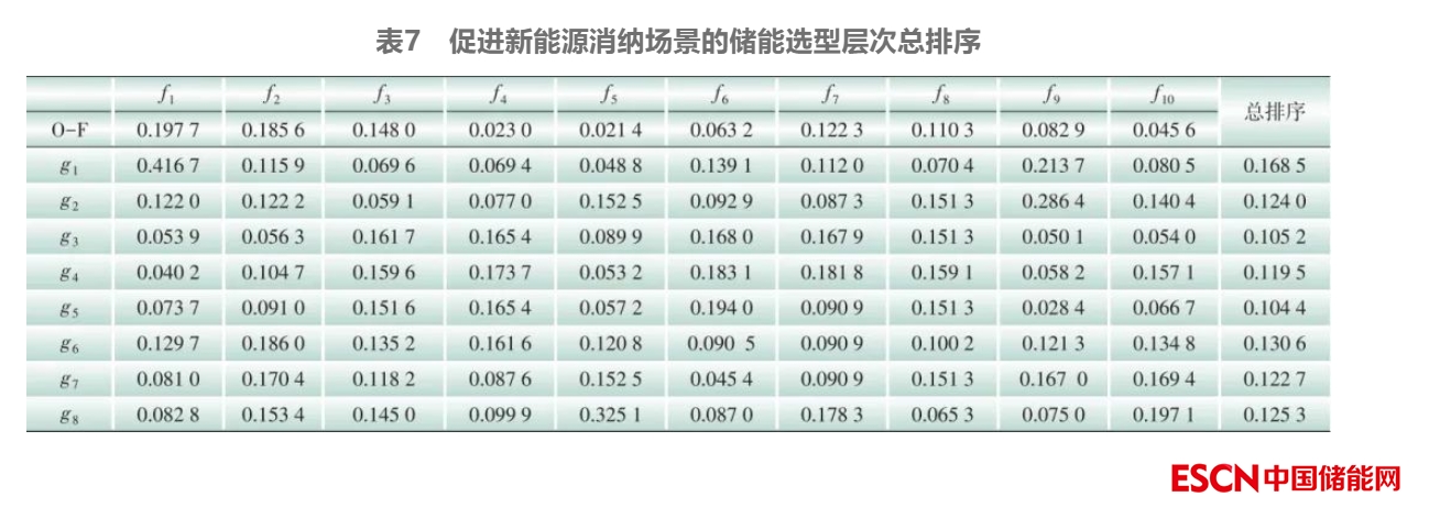 同樣,對(duì)標(biāo)準(zhǔn)層中每個(gè)標(biāo)準(zhǔn)下各方案進(jìn)行兩兩比較,計(jì)算標(biāo)準(zhǔn)層全部指標(biāo)的特征向量,并進(jìn)行一致性校驗(yàn),得出各判斷矩陣均滿足一致性即圖片。最后,基于公式(7)計(jì)算各決策方案的綜合評(píng)估指標(biāo),得到促進(jìn)新能源消納場(chǎng)景的儲(chǔ)能選型層次總排序如表7所示。