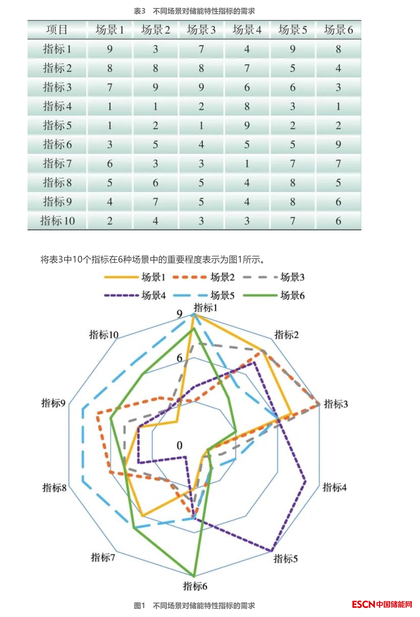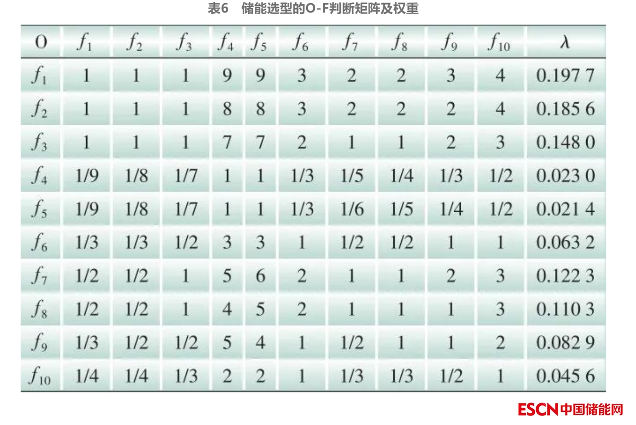 本文采用九級(jí)標(biāo)度法表示上述10個(gè)指標(biāo)在6種應(yīng)用場(chǎng)景中的重要程度,如表3所示。其中,標(biāo)度數(shù)據(jù)越大表示其重要性越高,如調(diào)頻場(chǎng)景3對(duì)充/放電速率(指標(biāo)2)、響應(yīng)時(shí)間(指標(biāo)3)要求較高,而對(duì)功率密度(指標(biāo)4)、能量密度(指標(biāo)5)和能量轉(zhuǎn)換效率(指標(biāo)7)則相對(duì)要求較低。