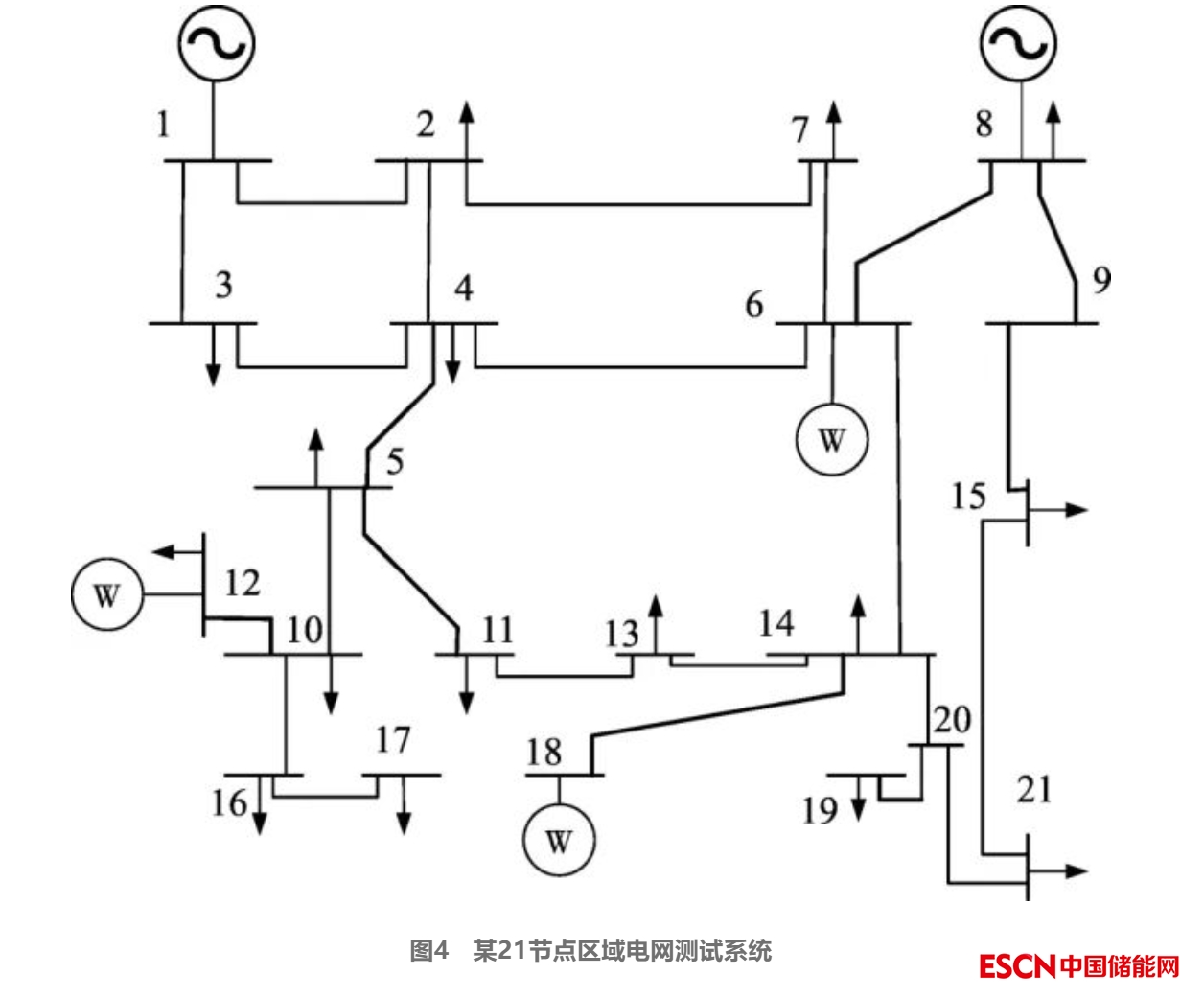 以圖4所示區(qū)域電網(wǎng)為算例進(jìn)行驗(yàn)證,該系統(tǒng)最大負(fù)荷為410 MW,通過(guò)節(jié)點(diǎn)1和8與外部大電網(wǎng)相連,風(fēng)電機(jī)組接入節(jié)點(diǎn)6、節(jié)點(diǎn)12、節(jié)點(diǎn)18,假設(shè)系統(tǒng)風(fēng)機(jī)發(fā)電滲透率為50%,風(fēng)機(jī)容量共205 MW。風(fēng)電等間歇性的可再生能源發(fā)電接入電網(wǎng)易發(fā)生潮流雙向流動(dòng)的現(xiàn)象,給新能源消納帶來(lái)挑戰(zhàn),并影響電網(wǎng)調(diào)壓,造成電網(wǎng)運(yùn)行指標(biāo)的下降。