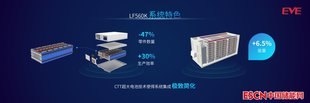 億緯鋰能從市場、客戶和產(chǎn)品技術出發(fā),基于CTT技術,LF560K電池可降低系統(tǒng)總成本,具有560Ah超大容量,單只電池可儲存1.792kWh能量,循環(huán)壽命超過12000次,滿足儲能市場高經(jīng)濟性需求。