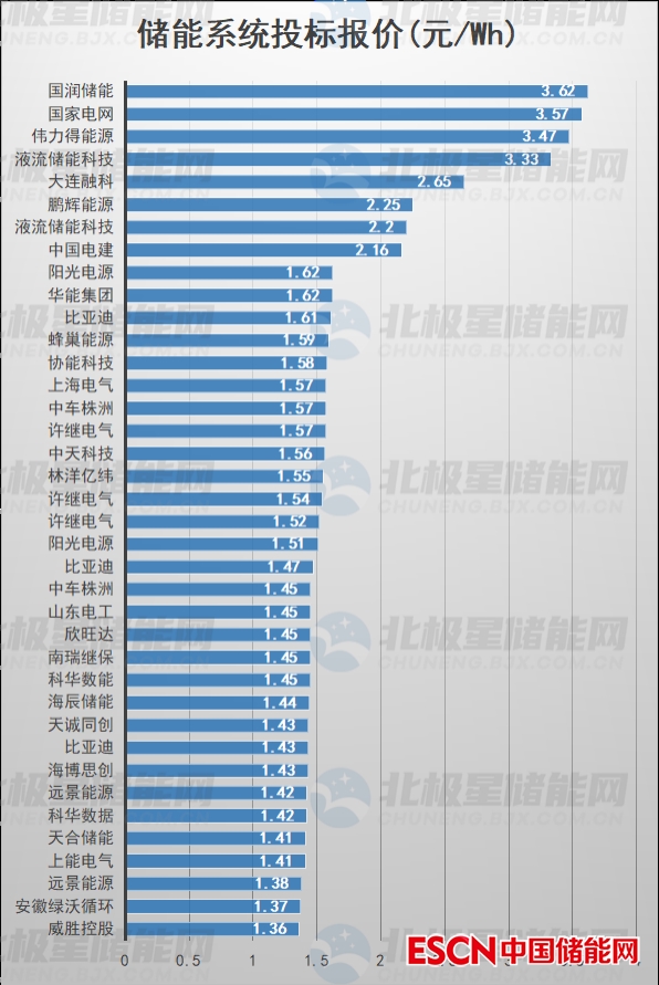 其中新能源配套儲能投標(biāo)報價最高的為華能甘肅永登坪城二期風(fēng)電7.5MW/15MWh儲能系統(tǒng)采購,中標(biāo)人為華能清能院,投標(biāo)報價2431.7萬元,投標(biāo)單價約1.62元/Wh。