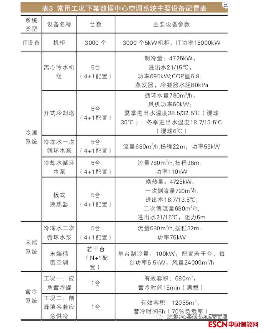 根據(jù)大量數(shù)據(jù)中心項(xiàng)目配置,建立一個(gè)數(shù)據(jù)中心常用模型,分析數(shù)據(jù)中心削峰填谷的能耗情況及經(jīng)濟(jì)性。其模型主要設(shè)置條件如下:數(shù)據(jù)中心設(shè)計(jì)配置3000個(gè)5kW的IT機(jī)柜;數(shù)據(jù)中心全部IT設(shè)備的平均負(fù)載率為滿(mǎn)負(fù)載的70%。