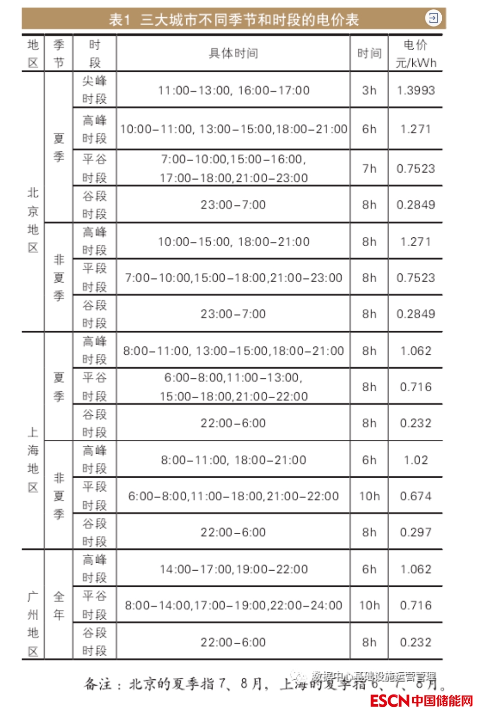 本節(jié)重點(diǎn)分析中國(guó)三大城市(北京、上海、廣州)的峰谷電價(jià)差,以10kV 工業(yè)用電為電價(jià)為典型參考值,來(lái)分析數(shù)據(jù)中心采用水蓄冷削峰填谷措施的經(jīng)濟(jì)性。表1為中國(guó)三大典型地區(qū)的峰谷電價(jià)差,可以看出,峰值的電費(fèi)約為谷段電費(fèi)的4倍。數(shù)據(jù)中心全年運(yùn)行,良好的峰谷電價(jià)差可以提高數(shù)據(jù)中心削峰填谷應(yīng)用的經(jīng)濟(jì)性。