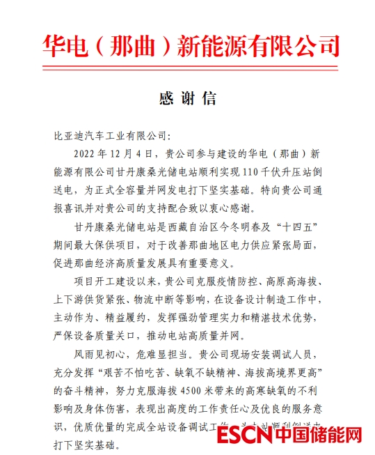2022年12月4日,比亞迪儲能參與建設(shè)的華電(那曲)新能源有限公司甘丹康桑光儲電站順利實現(xiàn) 110 千伏升壓站運行,為電站正式全容量并網(wǎng)發(fā)電打下堅實基礎(chǔ)。