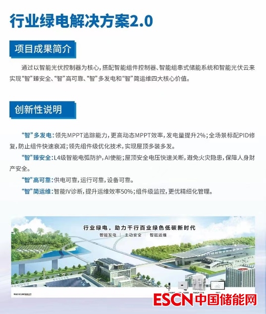面向行業(yè)用戶,華為智能光伏行業(yè)綠電解決方案2.0通過以智能光伏控制器為核心,搭配智能組件控制器、智能組串式儲能系統(tǒng)和智能光伏云來實現(xiàn)“智”臻安全、“智”高可靠、“智”多發(fā)電和“智”簡運維四大核心價值,滿足各類工商業(yè)場景需求。同時,華為智能光伏行業(yè)綠電解決方案2.0入圍創(chuàng)新成果案例集。