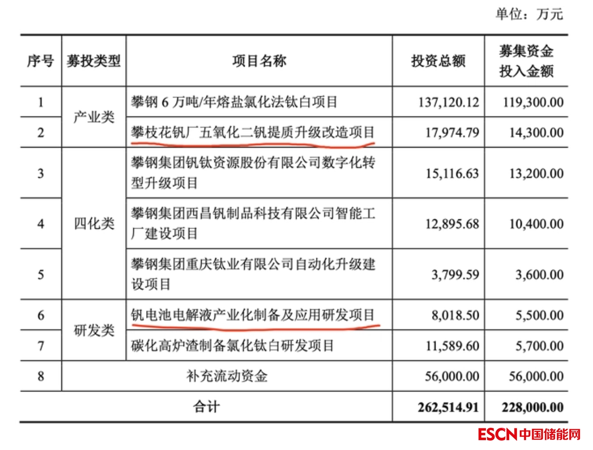 且正在進(jìn)行的非公開發(fā)行股票方案中,公司擬使用募投資金建設(shè)兩個(gè)釩儲(chǔ)能相關(guān)項(xiàng)目,包括投資1.80億元的攀枝花釩廠五氧化二釩提質(zhì)升級(jí)改造項(xiàng)目,以及投資8018.5萬元的釩電池電解液產(chǎn)業(yè)化制備及應(yīng)用研發(fā)項(xiàng)目。