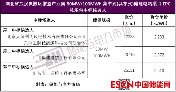 中國儲能網(wǎng)訊:近日,湖北省武漢黃陂區(qū)臨空產(chǎn)業(yè)園50MW/100MWh集中式(共享式)儲能電站項目EPC總承包中標(biāo)候選人對外發(fā)布。北京天源科創(chuàng)風(fēng)電技術(shù)有限責(zé)任公司&山東電工時代能源科技公司聯(lián)合體以總報價22333萬元,折合單價2.233元/Wh,成為第一中標(biāo)候選人。