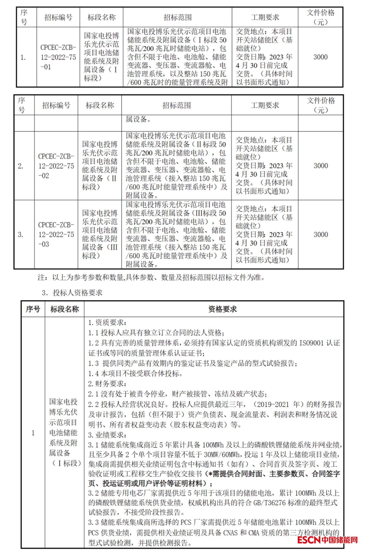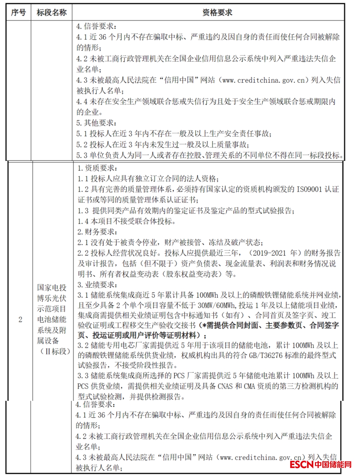 公告要求,儲能系統(tǒng)集成商近5年累計具備100MWh及以上的磷酸鐵鋰儲能系統(tǒng)并網(wǎng)業(yè)績,且至少具備2個單個項目容量不低于30MW/60MWh,投運1年及以上儲能項目業(yè)績。