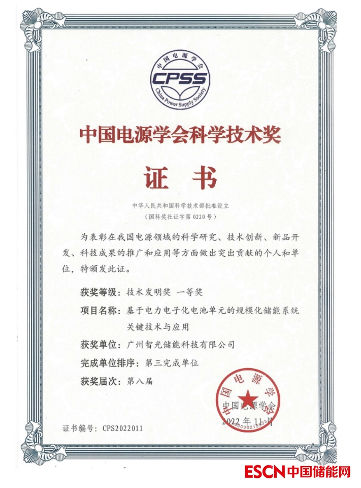 2、2022年11月,智光儲能參與的《基于電力電子化電池單元的規(guī)模化儲能系統(tǒng)關(guān)鍵技術(shù)與應(yīng)用》獲得第八屆中國電源學(xué)會科學(xué)技術(shù)一等獎。