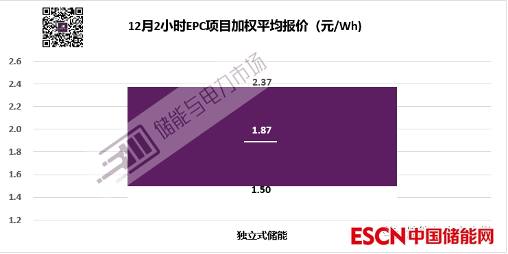 12月的儲(chǔ)能EPC中標(biāo)全部為獨(dú)立式儲(chǔ)能項(xiàng)目2小時(shí)儲(chǔ)能系統(tǒng),最高報(bào)價(jià)2.37元,最低報(bào)價(jià)1.50元,加權(quán)平均報(bào)價(jià)為1.87元/Wh。相比較11月2小時(shí)獨(dú)立式儲(chǔ)能項(xiàng)目EPC的加權(quán)平均報(bào)價(jià)2.044元/Wh,略有下降。