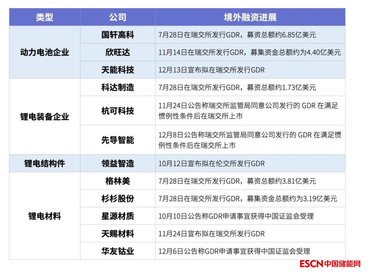 據(jù)不完全統(tǒng)計(jì),目前已有國(guó)軒高科、欣旺達(dá)、格林美、杉杉股份、科達(dá)制造5家公司通過發(fā)行全球存托憑證(GDR)獲得海外資本投資。國(guó)軒高科為國(guó)內(nèi)首家赴海外發(fā)行GDR并在瑞士上市的中國(guó)動(dòng)力電池企業(yè)。另外還有星源材質(zhì)、杭可科技等7家企業(yè)仍在申請(qǐng)發(fā)行GDR的進(jìn)程中。