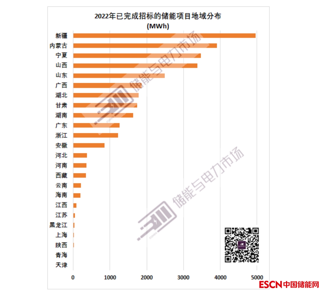 除集采等項(xiàng)目實(shí)施地點(diǎn)尚不明確的項(xiàng)目之外,2022年已完成招標(biāo)的項(xiàng)目共計(jì)分布在24個(gè)省市自治區(qū)。其中新疆、內(nèi)蒙古、寧夏、山西、山東五地的規(guī)模尤為突出,都超過(guò)了2GWh。