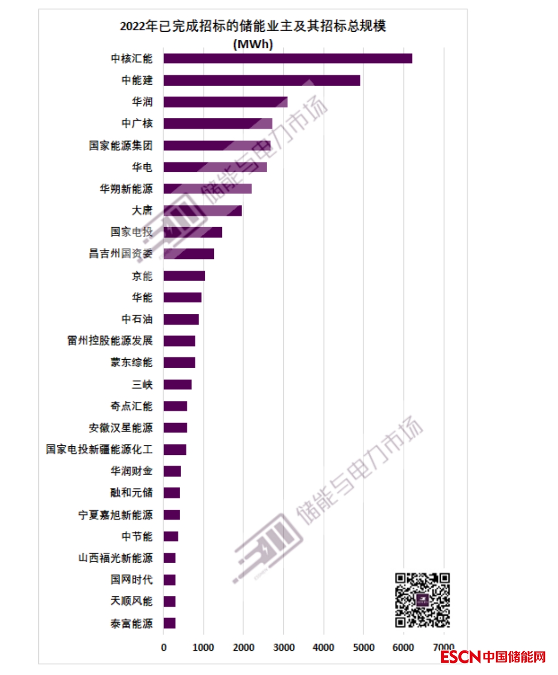 中核匯能、中能建、中廣核、華電、大唐等企業(yè)由于在2022年先后完成了GWh級(jí)的集采工作而名列前茅;