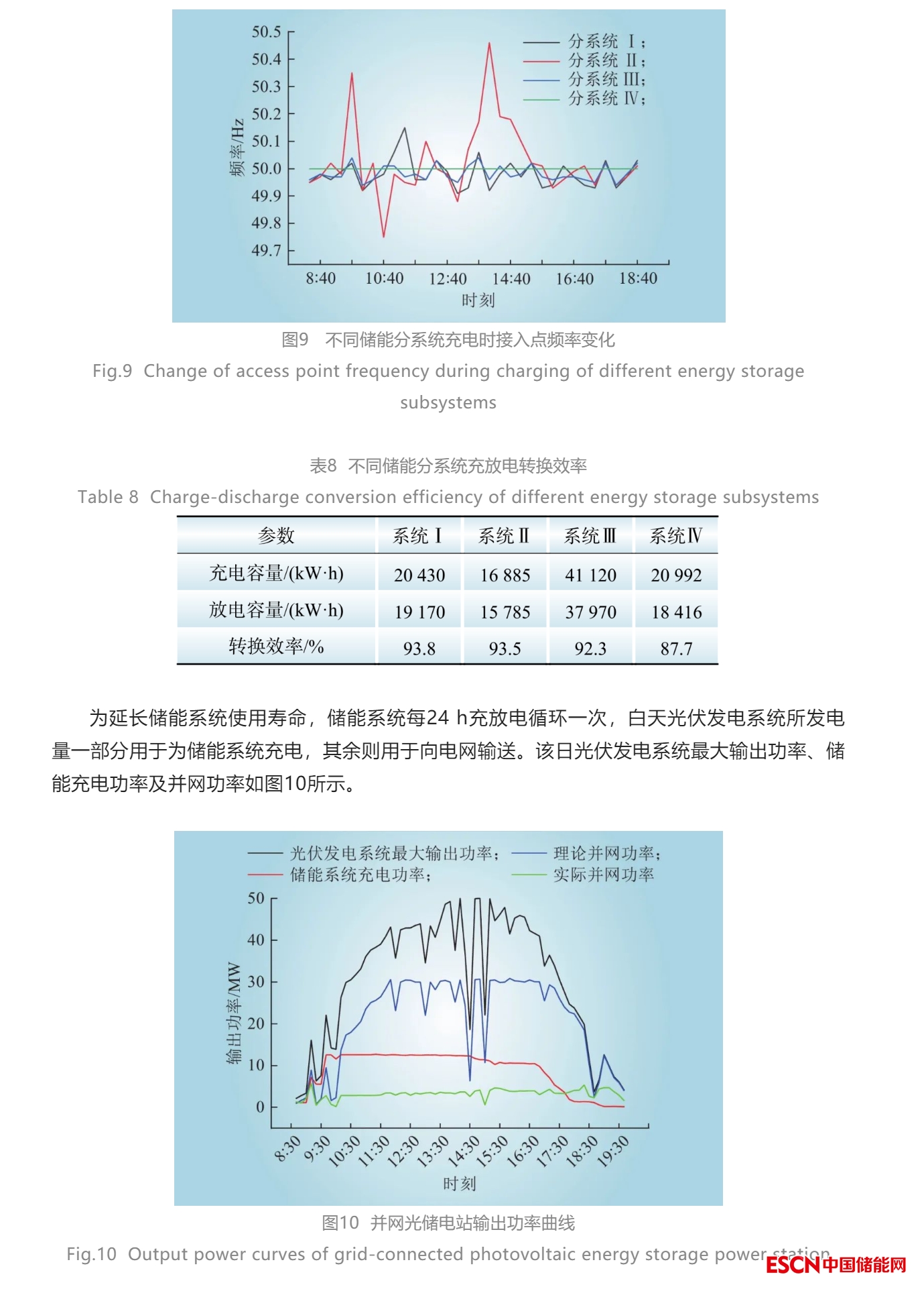 對(duì)比不同儲(chǔ)能分系統(tǒng)充電時(shí)段接入點(diǎn)頻率變化如圖9所示。由圖9可知,各儲(chǔ)能分系統(tǒng)對(duì)應(yīng)接入點(diǎn)頻率波動(dòng)范圍均滿(mǎn)足電網(wǎng)頻率波動(dòng)要求的50±0.5 Hz。其中,儲(chǔ)能分系統(tǒng)Ⅱ接入點(diǎn)頻率波動(dòng)最大,分系統(tǒng)Ⅰ次之,分系統(tǒng)Ⅳ接入點(diǎn)頻率十分穩(wěn)定,始終維持在50 Hz不變。儲(chǔ)能分系統(tǒng)充放電容量與轉(zhuǎn)換效率如表8所示,由表8可知,由于分系統(tǒng)Ⅳ采用變流器數(shù)量較多,自耗電較高,充放電轉(zhuǎn)換效率僅為87.7%;分系統(tǒng)Ⅰ、Ⅱ、Ⅲ充放電轉(zhuǎn)換效率相差較小,其中分系統(tǒng)Ⅰ的充放電轉(zhuǎn)換效率最高。就儲(chǔ)能系統(tǒng)引起電網(wǎng)頻率波動(dòng)而言,采用多臺(tái)小功率變流器更有助于系統(tǒng)有功功率均衡,降低接入點(diǎn)頻率波動(dòng);綜合接入點(diǎn)頻率變化和充放電轉(zhuǎn)換效率,儲(chǔ)能分系統(tǒng)Ⅰ較其他分系統(tǒng)波動(dòng)小、轉(zhuǎn)換效率高,綜合性能更好。