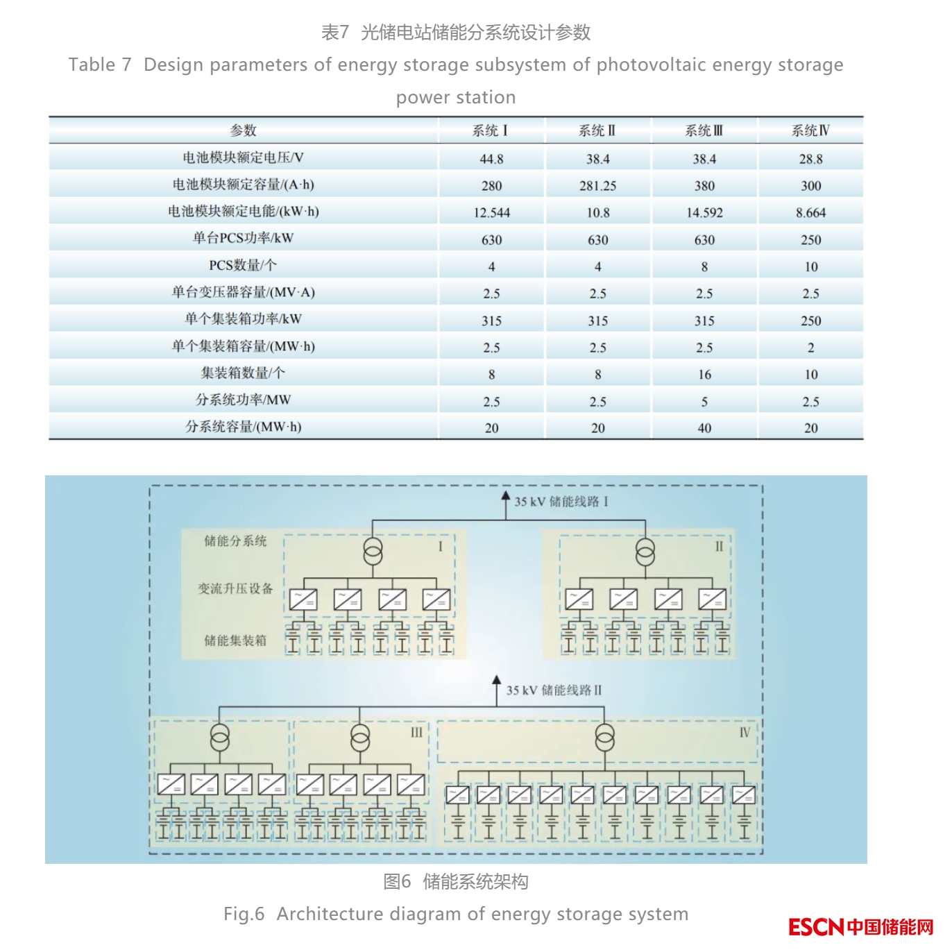 采用模塊化設(shè)計(jì)理念并結(jié)合儲(chǔ)能變流升壓設(shè)備功率約束,將總規(guī)模為12.5 MW/100 MW·h的儲(chǔ)能系統(tǒng)分為4個(gè)儲(chǔ)能分系統(tǒng)(分系統(tǒng)Ⅰ、Ⅱ、Ⅲ、Ⅳ)以?xún)苫氐姆绞浇尤?5 kV交流母線,與光伏發(fā)電系統(tǒng)匯流后經(jīng)50 MW主升壓設(shè)備升壓后接入110 kV主電網(wǎng)。光儲(chǔ)系統(tǒng)共交流母線連接,共用一個(gè)并網(wǎng)點(diǎn),可以集中全站多余電力對(duì)儲(chǔ)能系統(tǒng)進(jìn)行快速充放電,系統(tǒng)運(yùn)行更加經(jīng)濟(jì)高效。各儲(chǔ)能分系統(tǒng)設(shè)計(jì)參數(shù)見(jiàn)表7,儲(chǔ)能系統(tǒng)架構(gòu)見(jiàn)圖6。