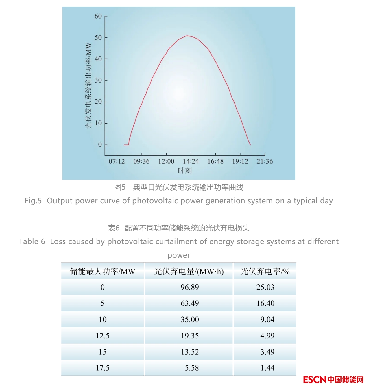 模擬夏至日光伏系統(tǒng)輸出功率曲線如圖5所示,由圖5計(jì)算可知,該日光伏系統(tǒng)最大可發(fā)電量約387.16 MW·h,但受地區(qū)調(diào)度限制,該電站最大允許并網(wǎng)功率僅為光伏最大裝機(jī)容量的60%,即30 MW,若不配置儲(chǔ)能系統(tǒng),將存在約96.89 MW·h電量損失,光伏棄電率達(dá)25%。配置不同功率儲(chǔ)能系統(tǒng)的光伏棄電損失如表6所示。