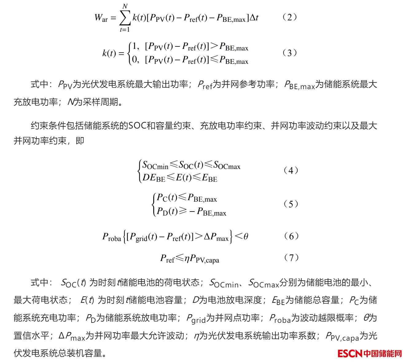 配置儲(chǔ)能以滿(mǎn)足系統(tǒng)并網(wǎng)需求,優(yōu)化并網(wǎng)光儲(chǔ)電站發(fā)電曲線,提升光儲(chǔ)電站消納能力。以光儲(chǔ)電站棄電量最小為目標(biāo),建立以電站日棄電能量損失為目標(biāo)函數(shù)的優(yōu)化模型,進(jìn)而對(duì)儲(chǔ)能容量進(jìn)行配置。儲(chǔ)能容量配置應(yīng)滿(mǎn)足白天光伏發(fā)電時(shí)段實(shí)現(xiàn)滿(mǎn)充,夜間放電時(shí)段結(jié)束時(shí),儲(chǔ)能系統(tǒng)存儲(chǔ)電能恰好放完,即每24 h進(jìn)行一次充放電循環(huán)。因此,僅考慮電池充電時(shí),光伏發(fā)電系統(tǒng)輸出功率與最大并網(wǎng)功率之差大于儲(chǔ)能系統(tǒng)最大充電功率時(shí),儲(chǔ)能系統(tǒng)無(wú)法完全吸收多余電量,需要對(duì)多余電量War進(jìn)行棄電處理。War表達(dá)式為