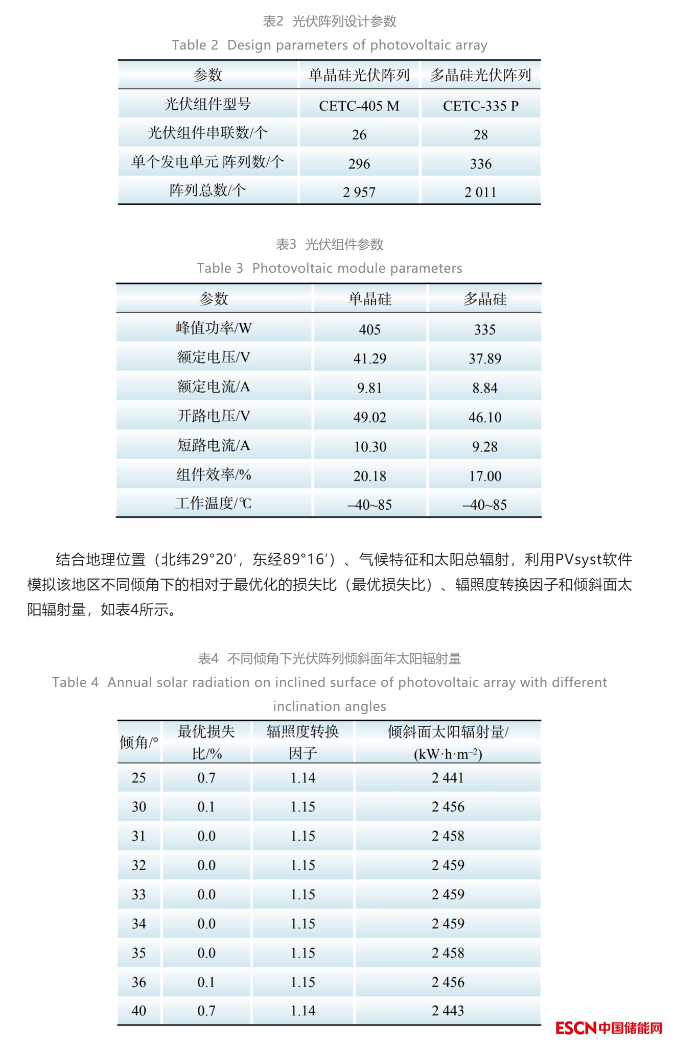 單晶硅光伏組件相較于多晶硅光伏組件具有更好的弱光性、更高的光電轉(zhuǎn)化效率和更低的衰減率,但多晶硅光伏組件技術(shù)更加成熟、綜合成本更低。根據(jù)光伏發(fā)電系統(tǒng)50 MW裝機(jī)容量和場(chǎng)址面積,選用26塊型號(hào)為CETC-405 M的405 W單晶硅光伏組件或28塊型號(hào)為CETC-335 P的335 W多晶硅光伏組件串聯(lián)組成1個(gè)光伏陣列,光伏陣列經(jīng)匯流箱匯流后接入光伏逆變器組成1個(gè)光伏發(fā)電單元,共16個(gè)發(fā)電單元、133190塊光伏組件。光伏陣列設(shè)計(jì)參數(shù)如表2所示,標(biāo)準(zhǔn)測(cè)試條件下(STC:AM1.5;1000 W/m2;25 ℃)2種光伏組件參數(shù)見(jiàn)表3。