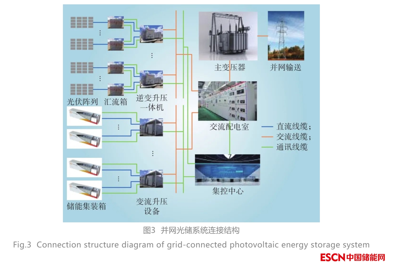 并網(wǎng)光儲(chǔ)電站由光伏發(fā)電系統(tǒng)、儲(chǔ)能系統(tǒng)和并網(wǎng)升壓系統(tǒng)組成。光伏發(fā)電系統(tǒng)包括由光伏組件串聯(lián)組成的光伏陣列、匯流箱和逆變升壓設(shè)備;儲(chǔ)能系統(tǒng)包括儲(chǔ)能集裝箱和變流升壓設(shè)備;并網(wǎng)升壓系統(tǒng)包括交流配電裝置和升壓變壓器等,連接結(jié)構(gòu)如圖3所示。
