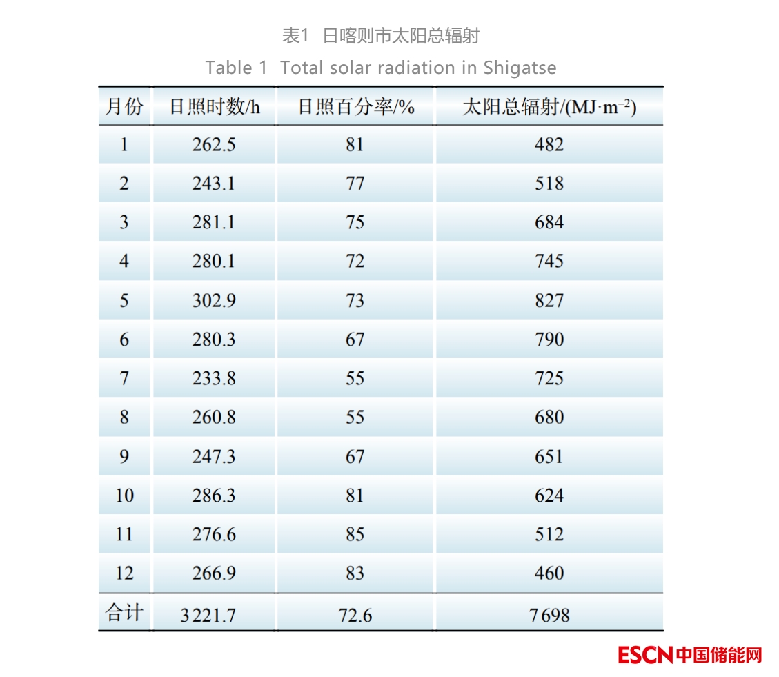 結(jié)合拉薩市氣候?qū)W計(jì)算方法的經(jīng)驗(yàn)系數(shù)和日喀則近30年月平均日照百分率,采用氣候?qū)W方法估算多年平均太陽(yáng)總輻射如表1所示。由表1可知,該地區(qū)年日照時(shí)長(zhǎng)達(dá)3221.7 h,太陽(yáng)總輻射達(dá)7698 MJ/m2,為太陽(yáng)能資源最豐富地區(qū)[20]。