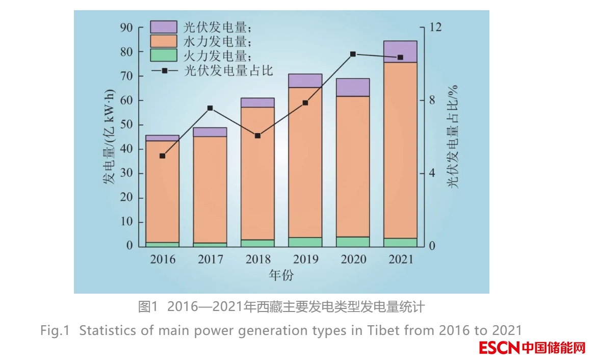 從電源結(jié)構(gòu)來(lái)看,西藏以水電為主,以光伏、火電作為輔助電源。圖1為2016—2021年西藏自治區(qū)水電、火電、光伏發(fā)電量統(tǒng)計(jì),由圖1可知,近年來(lái)西藏光伏發(fā)電得到了大力發(fā)展,其發(fā)電量由2016年的2.27億kW·h上升至2021年的8.73億kW·h,發(fā)電量占比由4.97%提高至10.35%。
