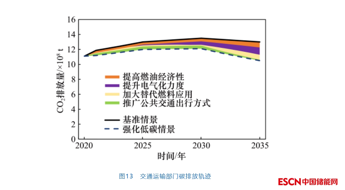 交通運(yùn)輸部門是化石能源消耗和CO2排放增長最快的領(lǐng)域之一。降低交通運(yùn)輸部門碳排放的主要技術(shù)措施包括:通過能效提升提高各類交通運(yùn)輸工具的燃油經(jīng)濟(jì)性,降低各類運(yùn)輸工具的運(yùn)行能耗;加大交通運(yùn)輸工具的電氣化程度,擴(kuò)大電動車和混合動力的應(yīng)用規(guī)模和范圍;發(fā)展燃料乙醇、生物柴油、燃料電池、可再生能源制氫及可再生合成燃料等替代技術(shù),加大替代燃料的應(yīng)用;大力發(fā)展公共交通,推廣公共出行方式(見圖13)。2025年前,提高燃油經(jīng)濟(jì)性、推廣公共交通是交通部門脫碳的主要路徑;2030年左右,提升電氣化力度將促進(jìn)交通部門進(jìn)一步脫碳;2035年新能源汽車保有量占乘用車比例將超過25%,電力占交通能源消費(fèi)總量比例將超過22%。隨著合成替代燃料技術(shù)的成熟以及以新能源為主體的電力系統(tǒng)逐步建成,2035年后可再生燃料替代將在交通運(yùn)輸領(lǐng)域減碳上發(fā)揮關(guān)鍵作用。此外,交通運(yùn)輸部門還需進(jìn)一步通過加快大宗貨物和中長距離貨物運(yùn)輸?shù)摹肮D(zhuǎn)鐵”“公轉(zhuǎn)水”等方式優(yōu)化運(yùn)輸結(jié)構(gòu),加快發(fā)展智慧交通,提高運(yùn)輸組織效率。