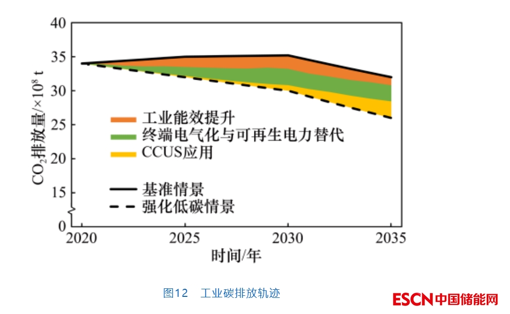 工業(yè)是僅次于能源電力部門的第二大CO2排放部門。基準(zhǔn)情景下工業(yè)部門的CO2排放先緩慢增長再下降,強(qiáng)化低碳情景下工業(yè)部門的CO2排放下降速度加快(見圖12)。工業(yè)領(lǐng)域能效的大幅提升、風(fēng)光清潔能源的應(yīng)用以及CCUS的規(guī)?;瘧?yīng)用將是工業(yè)碳排放降低的關(guān)鍵舉措。工業(yè)用能大約在2030年前后達(dá)峰,隨后進(jìn)入峰值平臺期。隨著工業(yè)行業(yè)終端電氣化水平的不斷提升,工業(yè)用能中電的比例逐步提高,預(yù)計(jì)2035年工業(yè)領(lǐng)域電能占比提高到37%以上;有研究指出2035年工業(yè)部門電氣化水平甚至可以達(dá)到40%以上。工業(yè)用固體燃料在2030年左右達(dá)峰并趨于穩(wěn)定,2035年煤等固體燃料占比約為43%、天然氣占比在8%以上。由于鋼鐵、有色、水泥、建材、化工等行業(yè)存在難以避免的碳排放,迫切需要加快CCUS技術(shù)的研發(fā)與部署,從而推動工業(yè)領(lǐng)域的碳減排。2030年后需要逐步開展CCUS技術(shù)的應(yīng)用,進(jìn)一步加快CCUS技術(shù)的滲透率。